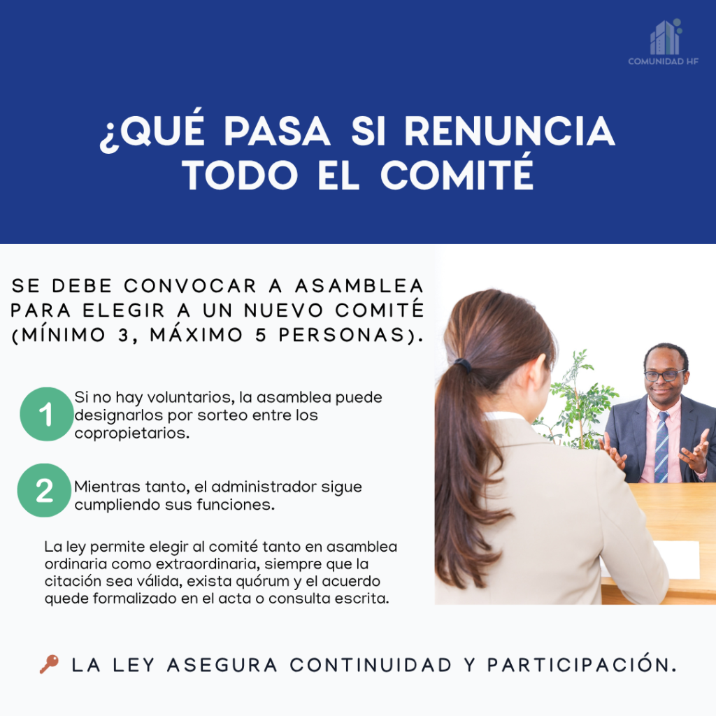- Convocatoria a asamblea extraordinaria: debe citarse a los copropietarios para elegir un nuevo comité, que debe estar compuesto por un número impar de personas (entre 3 y 5).
